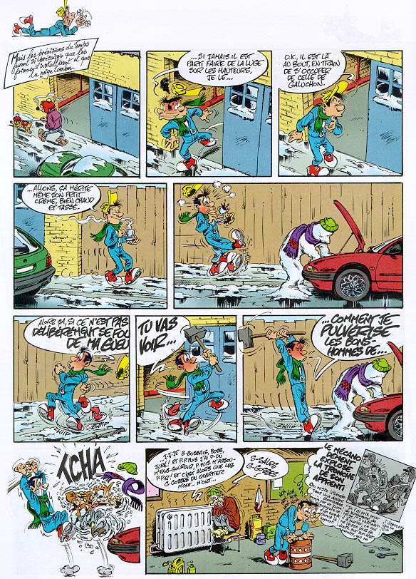 Isidore en voit de toutes les couleurs avec ses clients qui viennent de n'importe ou pour faire réparer n'importe quoi. Isidore est encadré par son apprenti et son concurrent direct, juste en face de son propre garage. Ici, on le voit aux prises avec son apprenti qui, une fois de plus fait des siennes : Cette fois, il se fait remplacer par un bonhomme de neige... Croit-on !