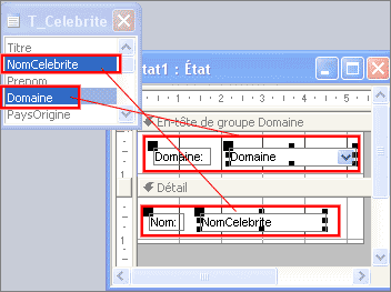 Faites glisser le champ Domaine dans l'en-tête de groupe Domaine, et le champ NomCelebrite dans la section Détail, comme ceci :