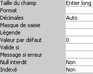 Chaque table est pourvue d'un certrain nombre de champs. Chacun de ces champs est d'un type particulier (Texte, Numérique, Date) selon le genre de chose qu'il va contenie. Un champ Taille va être numérique. Un champ Téléphone va être Texte (Et oui : Un numéro de téléphone peut contenir des points, les parethèses, des espaces...). Ces champs ont certaine options :