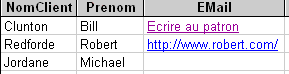 Oui. Par exemple, imaginons que ce ne sont pas des clients particuliers, mais des sociétés. Nous pouvons alors indiquer leur adresse Web dans un champ Lien Hypertexte. Nous avons déjà un champ Lien Hypertexte : EMail. Ce n'est pas parce qu'il s'appelle EMail, ni parce qu'on y a mis une adresse E-Mail (billclunton@uscomp.com) que ce champ est exclusivement destiné à recevoir des adresses E-Mail !