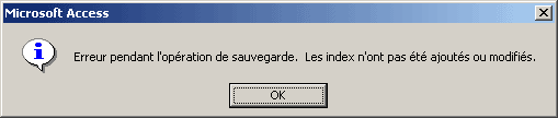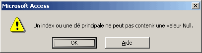 Eh oui : N'oubliez pas qu'à la base, nous avons voulu définir une clé primaire sur NomClient pour empêcher les doublons ! Ce message est plus explicite : "Risque de doublons dans champs Index, clé principale ou relation interdisant les doublons"... En gros, tant que vous avez deux personnes qui s'appellent Miresmo (même si elles ont des prénoms différents), la clé primaire (Clé principale - identifiant : Ce sont des synonymes) ne sera PAS applicable !