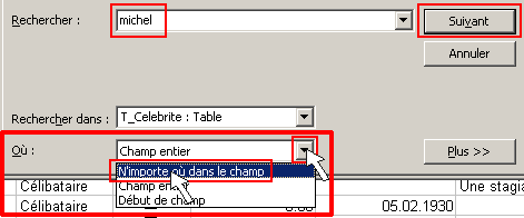 Pas encore ! Il existe peut-être d'autres Michel dans cette table ! Jusqu'ici, nous avons cherché les champs entiers. C'est à dire que s'il y avait eu un Jean-Michel, Access ne l'aurait pas trouvé.
