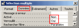 | Non | Non | On peut changer les données (pas verrouillé), mais comme on ne peut pas cliquer dans le champ (pas activé), on est bien avancé ! En fait, dans ce cas de figure, le champ apparaît en grisé, comme quand vous êtes dans une boîte de dialogue et que certaines options sont en grisé : on ne peut pas les sélectionner parce que c'est impossible pour le moment (Comme quand vous ne sélectionnez rien du tout et que vous essayez de faire "Edition/Copier", c'est impossible, parce qu'il n'y a rien à copier) |