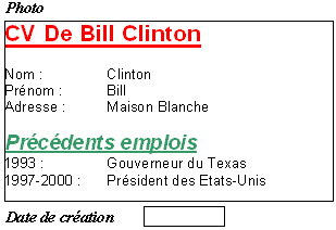 Tout en haut de la page, vous avez un rappel du nom de la table : "T_Celebrite", et, l'un en dessous de l'autre, tous les champs sont présents (Titre, Nom, Prénom, etc.) de la première personne trouvée dans la table T_Client : Napoléon Bonaparte. Plus bas, vous voyez sa photo, mais il n'y en a pas, c'est la raison du grand rectangle blanc.