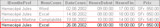SommaireComme vous avez peut-être fini par le découvrir par vous-même, il est strictement impossible de s'en sortir en créant une seule table : Nous allons devoir séparer les données dans 2 tables. Dans la première table,, nous allons avoir les champs qui n'apparaissent qu'une seule fois par cours : IdentiteProf, DateCours, HeureDebut, HeureFin et Prix. Dans l'autre table, nous allons avoir les identités des élèves.