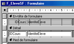 Essayons. En mode création, les utilisateurs d'Access 2000 n'auront pas rop de difficultés à effacer IDCours et son étiquette, mais les utilisateurs d'Access 97 devront cliquer deux fois sur la zone d'accueil du sous-formulaire pour l'activer, et ensuite fermer le formulaire F_EleveSF pour revenir à F_Cours.