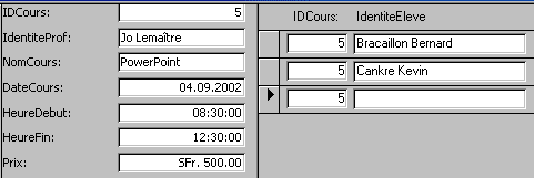 Actuellement, vous avez donc à disposition deux formulaires distincts, qui fonctionnent parfaitement l'un sans l'autre, il n'y a actuellement aucune interaction entre eux : F_Cours liste les cours, un cours par écran, F_Eleve liste les élèves et leur numéro de cours, plusieurs enregistrements par écran, tout bêtement. Jusque-là, rien de magique, donc.