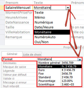 Nous allons revenir à des notions plus basiques. Définissez SalaireMensuel comme étant un type Monétaire. Pour le format, vous avez trois choix pertinents : Monétaire, Euro et Standard.