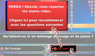 Dans le vrai jeu, une fois que le candidat a la question en face de lui, il peut simplement s'abstenir de répondre et ainsi empocher ses gains. J'aurais pu ajouter un bouton "J'empoche mes gains", mais je ne voyais pas trop l'intérêt... Dans le cas ou vous jouez sur un écran géant, et que vous assurez l'animation, il suffit que le candidat vous dise "J'arrête" pour simplement lui répondre "vous avez gagné tant d'euros", en se référant à l'échelle des gains sur la droite.