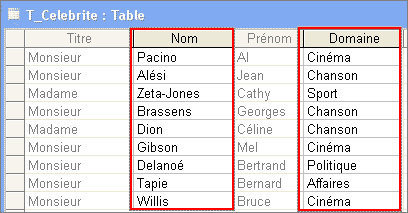 Il s'agit de sortir un état, sur 3 colonnes, avec la liste de tous les noms des célébrités, ainsi que leur domaine d'activité, groupé, justement, par leur domaine.