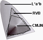 Attention également : les 4 couleurs CMJN sont calculées en pourcentages, ce qui fait qu'il va forcément exister des couleurs RVB qui n'existeront pas dans la palette CMJN. Lorsqu'on sélectionne dans la palette RVB une couleur n'existant pas dans la palette CMJN, une icône avec un point d'exclamation apparaît avec la couleur la plus proche proposée dans la gamme CMJN. Les couleurs n'existant pas dans CMJN sont simplement les couleurs trop lumineuses.
