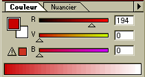 Les 3 curseurs représentent donc respectivement les couleurs Rouge Vert Bleu. On devrait pouvoir déplacer les tirettes d'unité en unité, de 0 à 255, mais comme il n'y a que 100 pixels de large, on ne peut pas être aussi précis. Il est nécessaire alors de taper les valeurs dans les zones d'édition correspondantes.