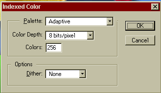Si on enlève la coche Dither, c'est qu'on ne désire pas de couleurs simulées, et dans ce cas, lorsque Photoshop hésite entre 2 couleurs, au lieu d'alterner un pixel d'une couleur avec un pixel d'une autre couleur, il choisit simplement la teinte la plus proche